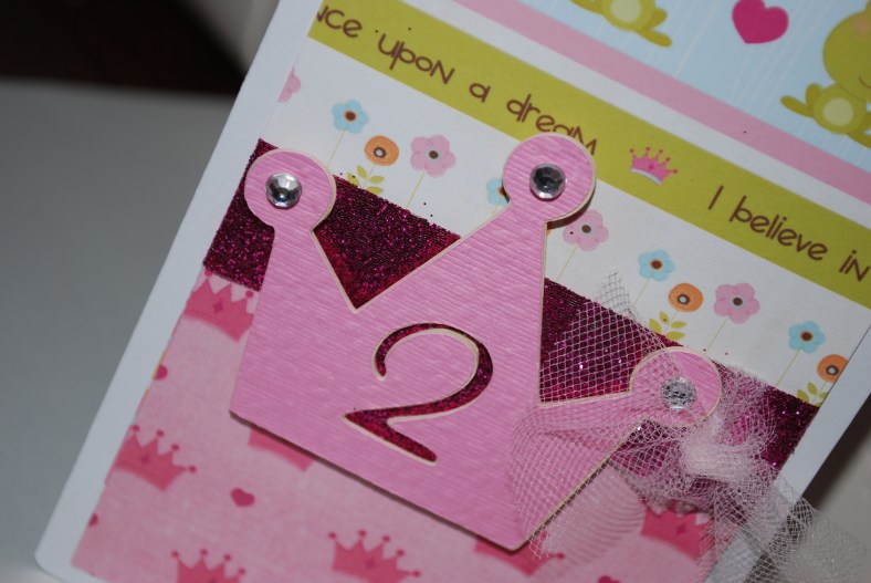 Paper from Michale’s Individual sale paper- Once Upon a Princess Cricut Cartridge. I used the faux chip board method on the crowns.