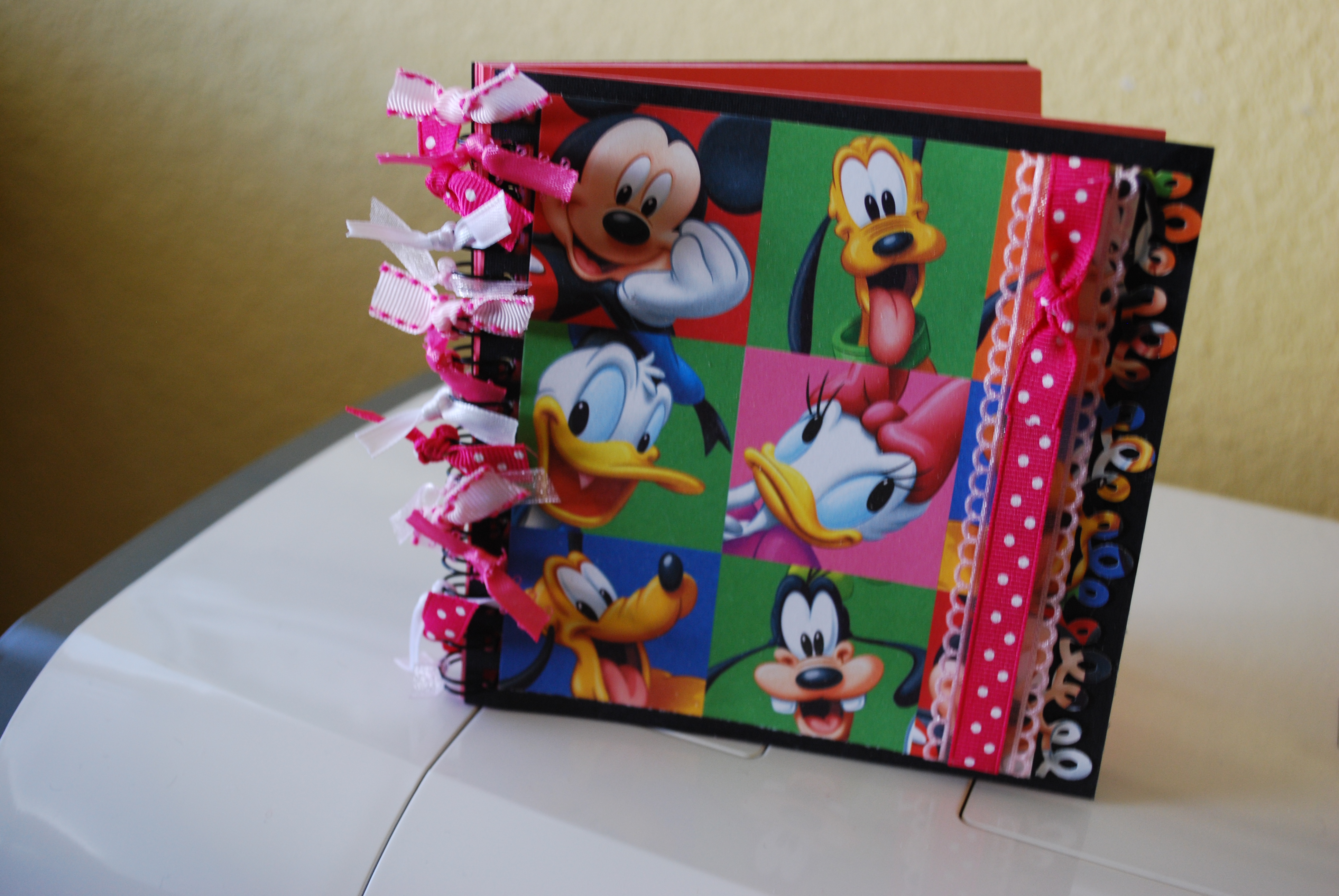 I also had to come up with an autograph book for our nearing trip to Disneyland! For a special treat we are going to have breakfast with the characters and I have been told that it would be a good idea to have an autograph book for the kids to have Mickey and Cinderella and the gang to sign. I found the books in the $ bin at Michael’s and dressed it up with using a Disney themed cardstock I found for .60. Using my Martha Stewart “rope punch”and then used some ribbon I had on hand to dress it up a bit. I made two of these.