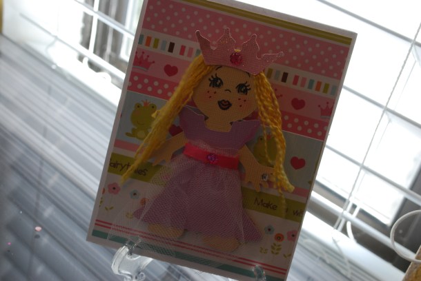 I helped a friend with her party invites and a few other things for her daughter’s “Tangled” party. We came up with a cute invite and executed it well. When I got the invite in the mail, I disassembled it and made a birthday card for the guest of honor with the little princess. I added some tulle and a few more bling! I wanted her to have a keepsake for all her hard work in prepping such a wonderful party… Trust me.. the invite was only the beginning of the amazing factor to this princess event. My daughter is still talking about it!