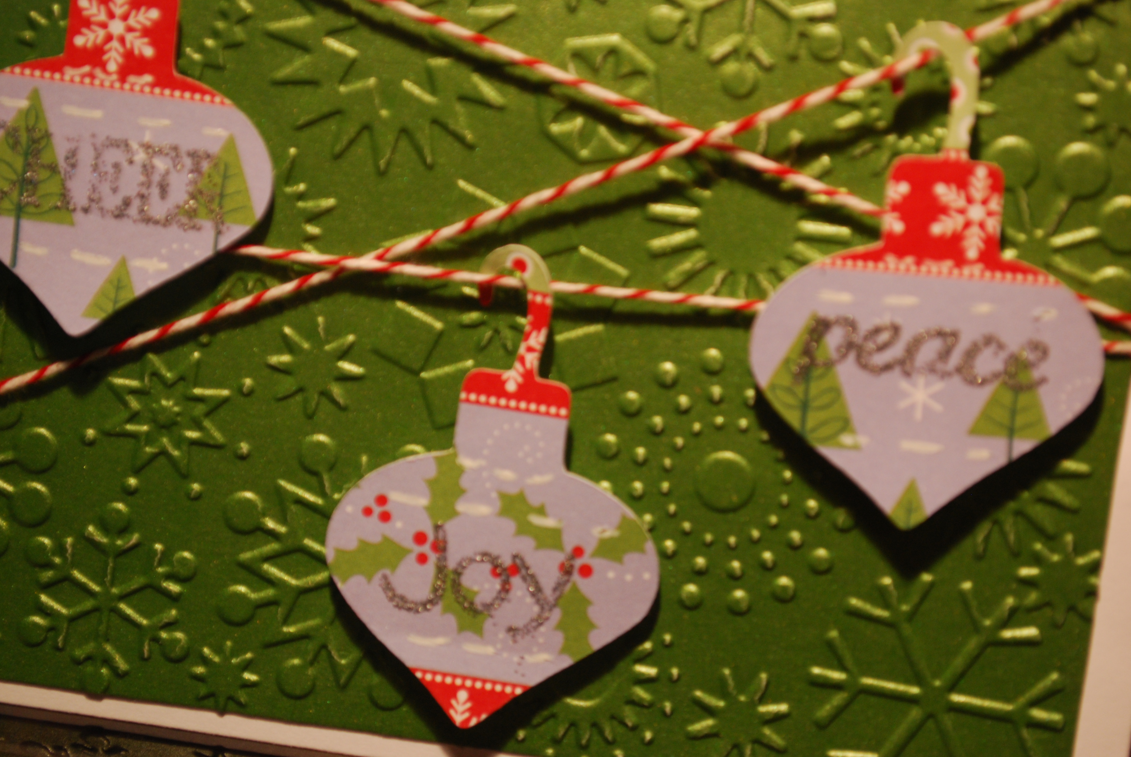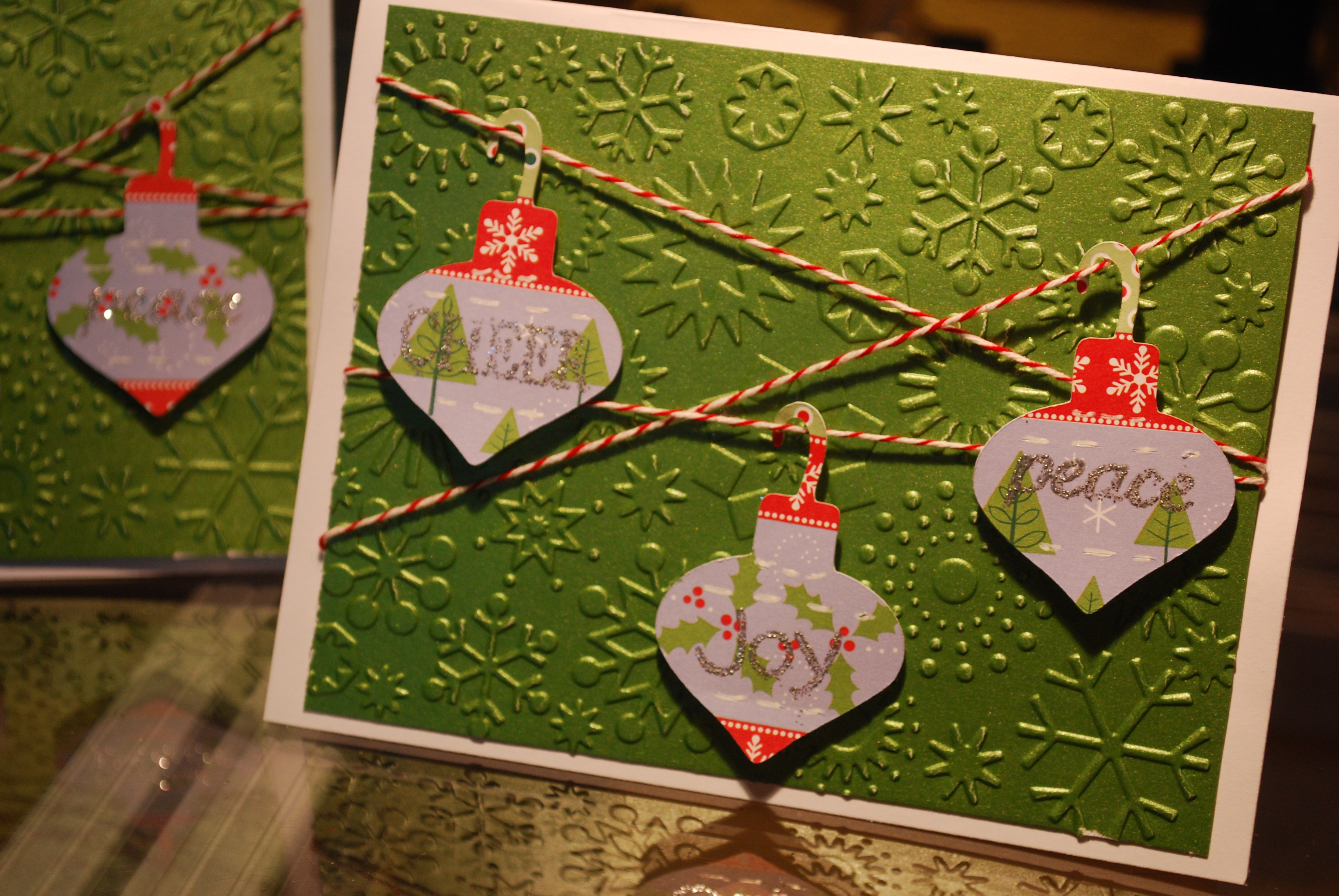[Project 7:  Christmas cards for some bloggging buddies I have formed this year.  I used a Christmas stack from Papertreyink, Christmas stamp set from My Pink Stamper and the ortament came from Simply Charmed.