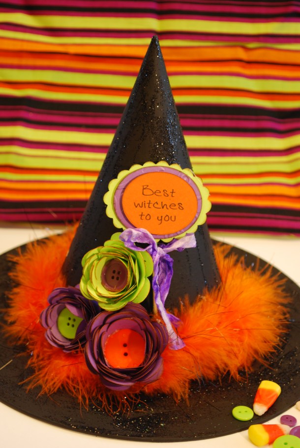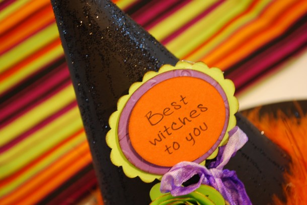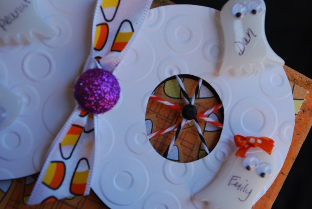 For the banner, I used the basic circle cut from Mini Monograms at 1 and 1.5 inches. I stamped each orange circle with Halloween sentiments from Close to My Heart, Perfect Fit Halloween stamp set using black in from Stampin’ UP. I embossed the black circles with Cuttlebug’s Spots and Dots folder. I threaded orange baker’s twine from Twinery and glued down with my ATG gun. I finished the witch by nesting her using hot glue onto some sparkling black and purple tulle that I made into a flower and pinned into the foam wreath.