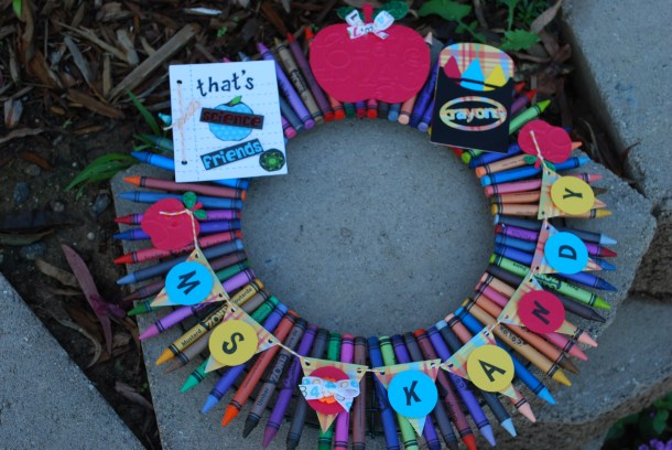 It was a bit more labor intensive than I expected and what I used was a wire wreath and flipped it over and placed a glass bowl in the middle to line up the crayons perfectly.  I then hot glued the crayons to the wire . . . that was a bit tricky, but I figured it out.