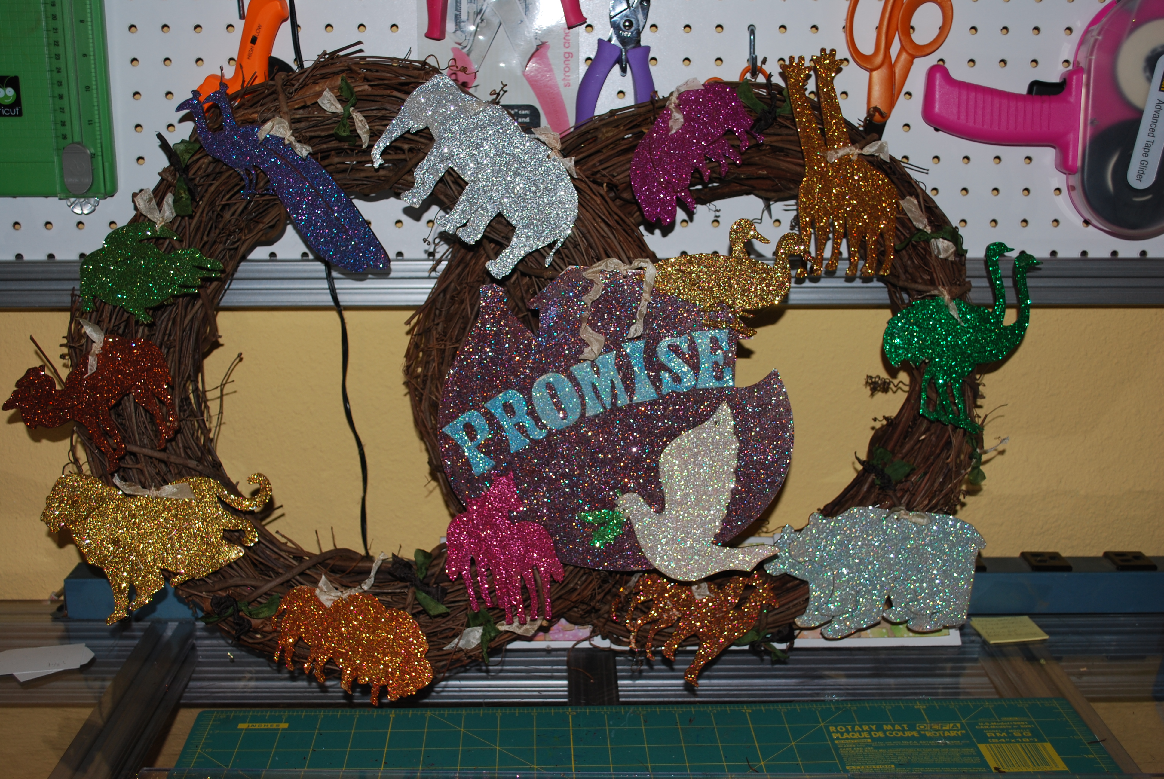 I had a heck of a time finding a big enough wreath to fit everything and I wanted a rustic year-round wreath so I stuck with grapevine.  I welded the two 18 inch wreaths I found at Michael’s with zip ties and then glittered the components.  WHAT A MESS! My hard floors will ever resemble a disco ball!  I then hot glued the animals in pairs and then found some wooden letters to add the word “Promise” on the Ark – that was not part of the kit.