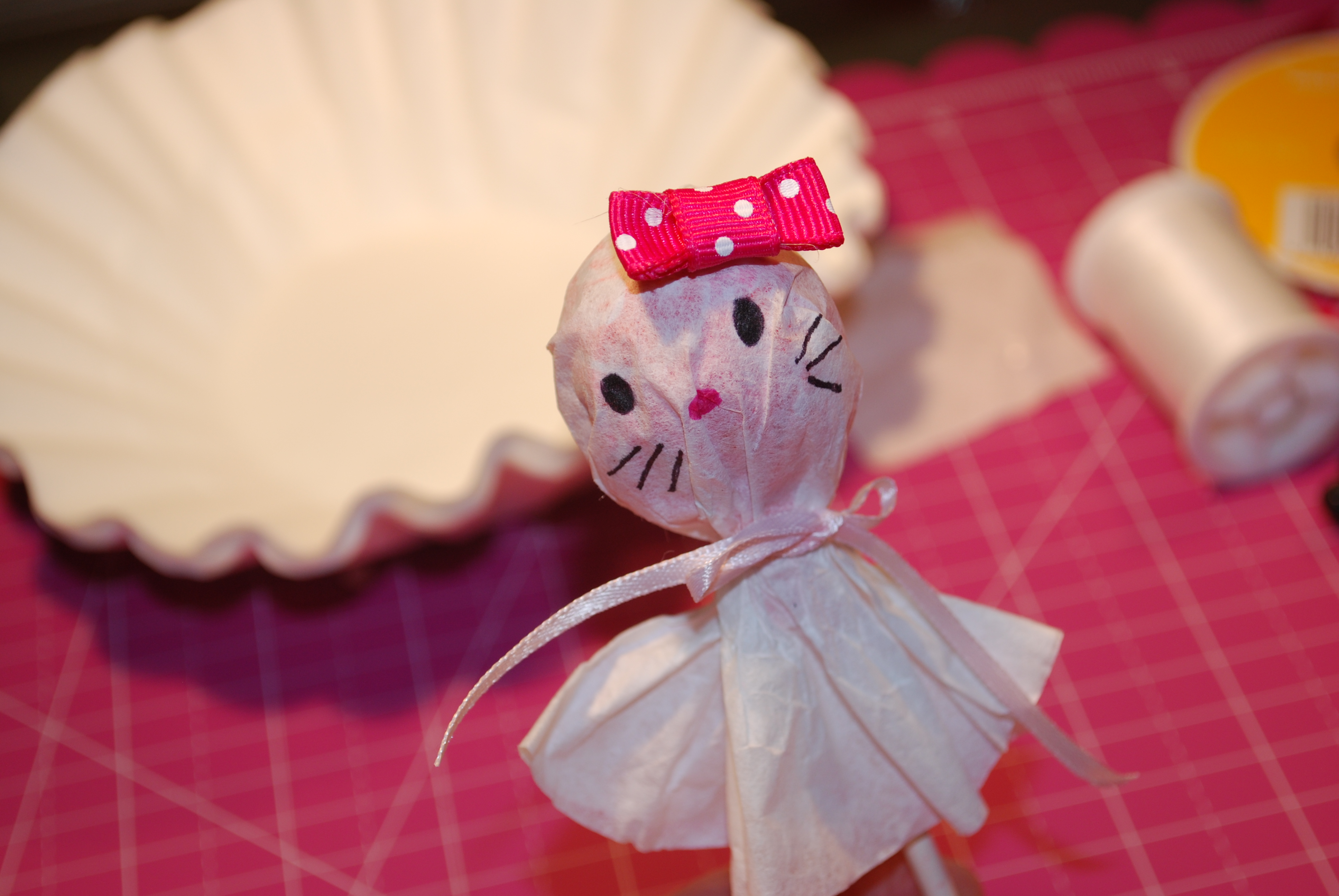 I have glass containers I found at Home Goods that I use for these types of events.  I headed into my attic and dug through some Christmas decorations and found the fillers for them along with the styrofoam HK heads I made (I bought those online in a set 12- WAY cheaper than at Jo-Ann’s and Michael’s.)  I made the heads by cutting out felt bows and suing a sharpie to do the eyes, nose and whiskers. I hot glued the bows on.