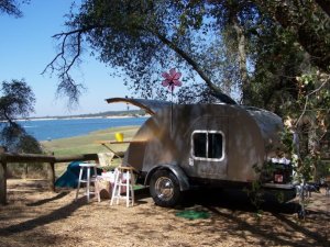 This card is going to be a birthday card for the hubs that we will be celebrating in a week.  We love camping and he built a custom teardrop camper for us to honeymoon in 7.5 years ago.  He did not use plans, he just took the profile dimensions that he found from a  1948 Popular Mechanics issue.  It took him about 3 months to build and most of this project was powered by ebay.