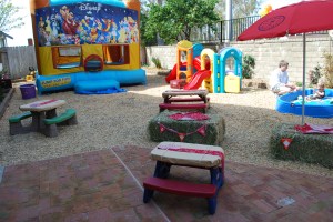 For eating areas, I opted not to rent table and chairs sand I borrowed a couple of kiddie picnic tables from friends and covered them with butcher paper and a bandana material table runners and secured with raffia to add a more “rustic” feel. I found the material at a fabric store on sale and used my pinking sheers to make the table runners. I went the no-sew approach. I added the mini tins filled with the markers and crayons that I enhanced with sheriff stars to each place setting. This was a built in craft idea for the kids. Now they could color on the table using the butcher paper.